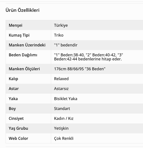 1 Renk 3 Beden