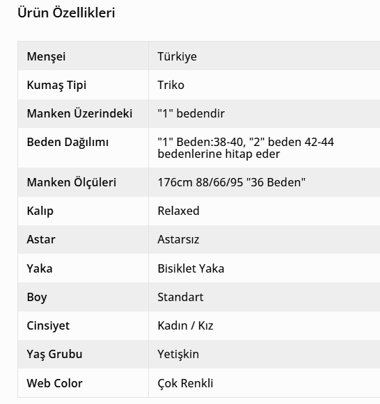 1 Renk 2 Beden